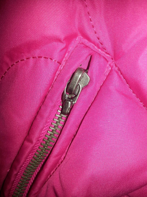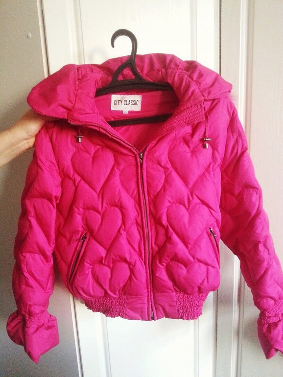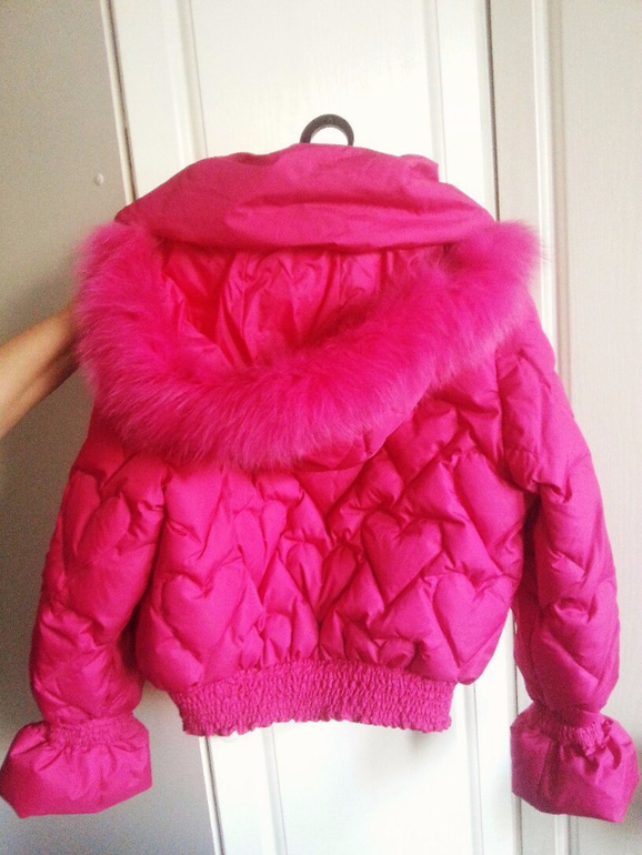 Продаю короткий пуховик, цвета фуксии, с объемным капюшоном и воротником стойкой, прошит строчкой в форме сердца. На капюшоне меховая отделка. На замках отсутствуют собачки (см фото ниже) . Самовывоз 5 мин на транспорте от м.Шаболовская /тульская