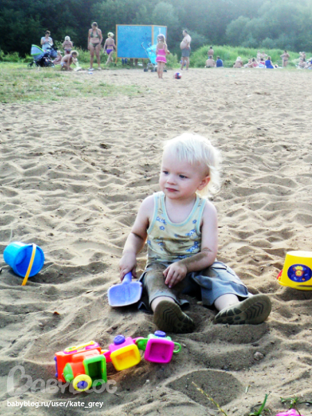 В этом месяце жара вдохновила выбраться нас на пляж. В 20 мин ходьбы у нас Клязьма. Купаться не рискуем, но позагорать маме, порыться в песке Ване - милое дело. Ваня как-то сразу просек что на пляже все лежат на своем одеяле, дальше одеяла никуда не уходит. Маме можно отдыхать.