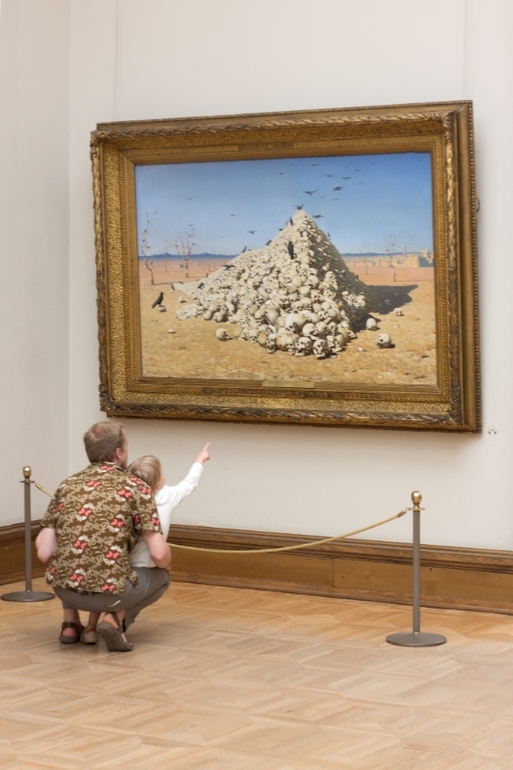 Ваня пробежал все быстро, рассматривал только картины с военными, с кораблями. Понравился Айвазовский, Врубель, Верещагин. Особенно впечатлила картина Апофеоз войны. Два раза обошел церковный зал. Евангелия в шикарных окладах и богатые чаши его очень заинтересовали. Сказал что это настоящий клад, сокровища (пиратская тема). Спросил о статуях голых теть: почему у них нет головы? Мы не нашли что ответить.