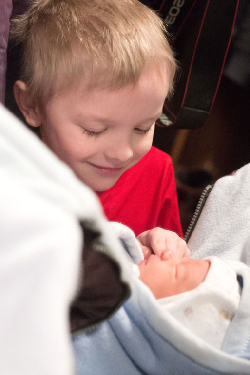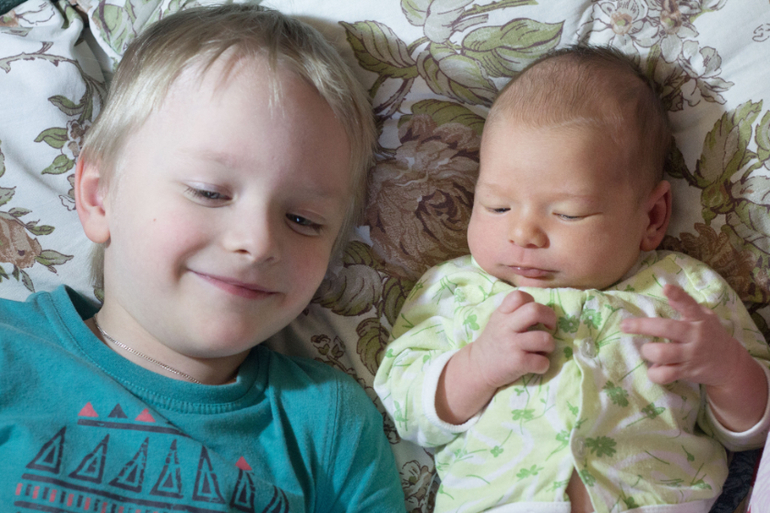 Первый день когда мы приехали шумел, все раскидывал, вел себя шумно очень, но потом когда понял что Саня только спит, ест грудь, какает и кряхтит успокоился)) Стал вести себя как обычно.