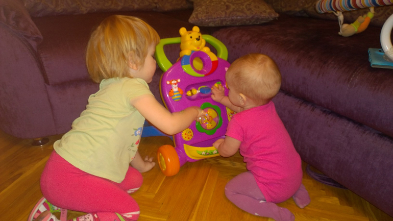 Любит провода... ужас) я их прячу, а она все равно находит (спасибо папе). Играет с Полинкой) очень ее любит. Даже когда Полинчик сидит, задумавшись, на горшке, приползает с какой-нить игрушкой и зажигает)