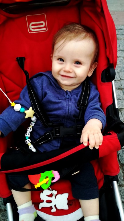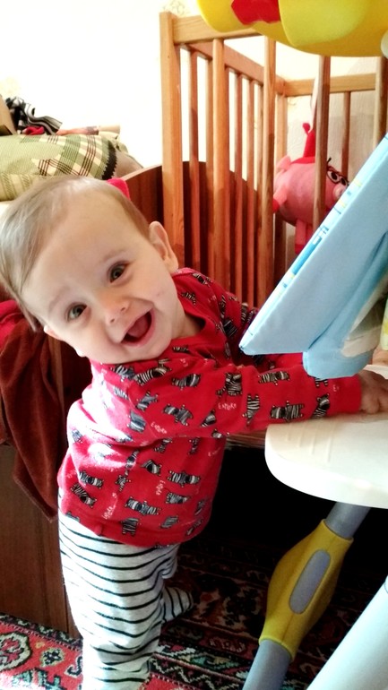 До этого целый месяц ходил сначала за две руки, потом уже за одну и учился просто стоять.