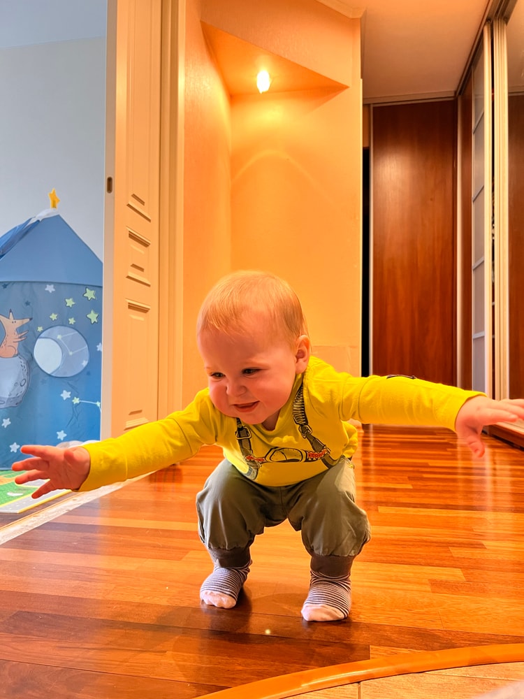 Начал пытаться играть в ролевые игры с игрушками: взял пупса и начал им «танцевать». Это случилось после того, как папа показал ему игры со свинкой и овечкой.