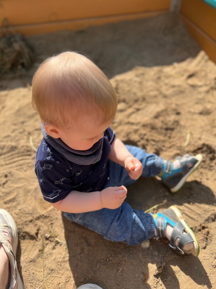 Умеет кидать мячики, крутить их, пытается ногами пинать, но ему пока больше интереснее руками.