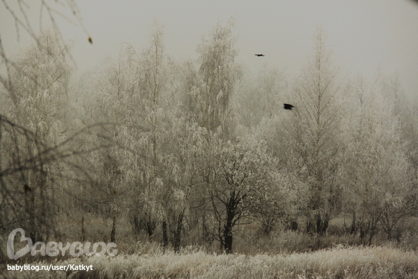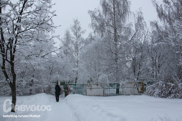 у нас сегодня. Потеплело до -11 (с -23 градусов) Утром вообще красотища была, всё-всё белое. К вечеру, конечно, пооблетело с верхушек. Вот так мы шли из сада: