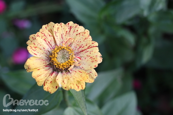 Для поднятия настроения дарю вам, подруженьки мои, необычной окраски цинию, которая распустилась в нашем саду на даче.