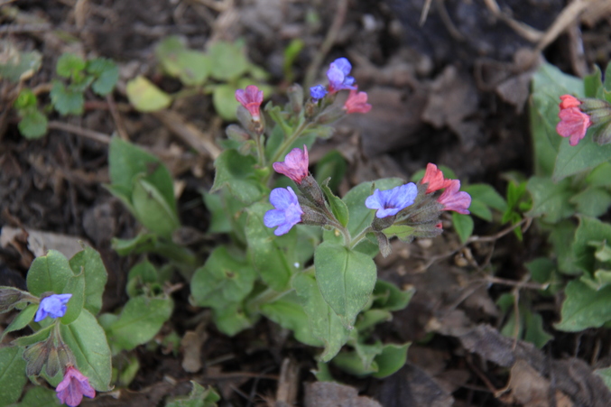 Медуница, которая, кстати, занесена в Красную Книгу. У неё есть одна особенность: меняет окраску венчика в процессе распускания новых цветоносов. Розовые - только распустившиеся цветочки, голубые - отцветающие.
