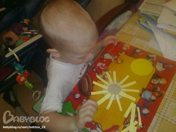 Сам мазал клеем, сам нарезал полоски (я подставляла бумагу, он чикал ножницами), приклеивали вместе).