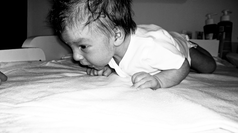 Очень сильный, вертлявый! Вечно куда-то ползет, или пытается, по крайней мере. Вертится с одного бока на другой, будет пыхтеть, пока не ляжет так, как ему хочется. Сегодня перевернулся с живота на спину, но мы решили, что это все же случайность.