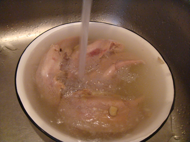 Варить час. Затем вынуть из бульона, положить в проточную воду: