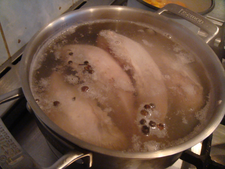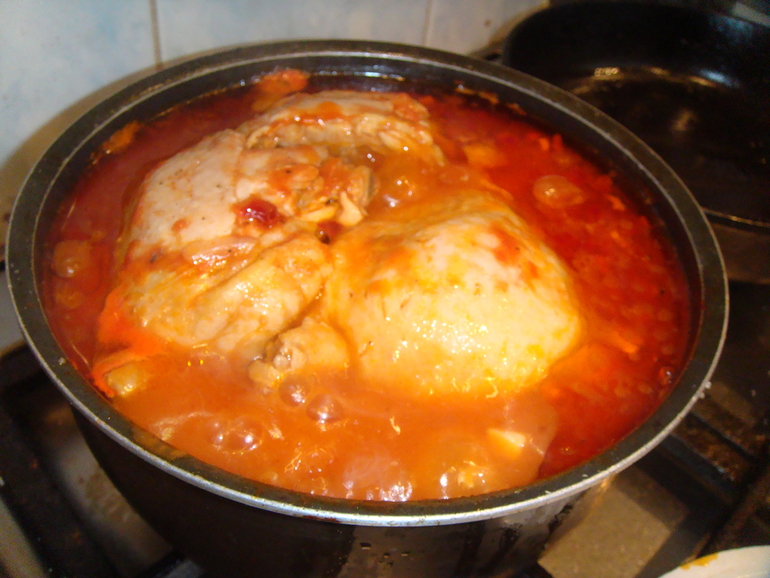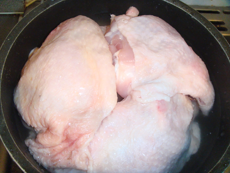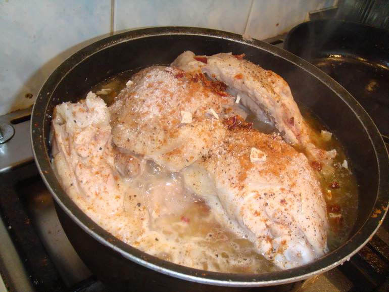 Потом куски курицы, немного присоленные: