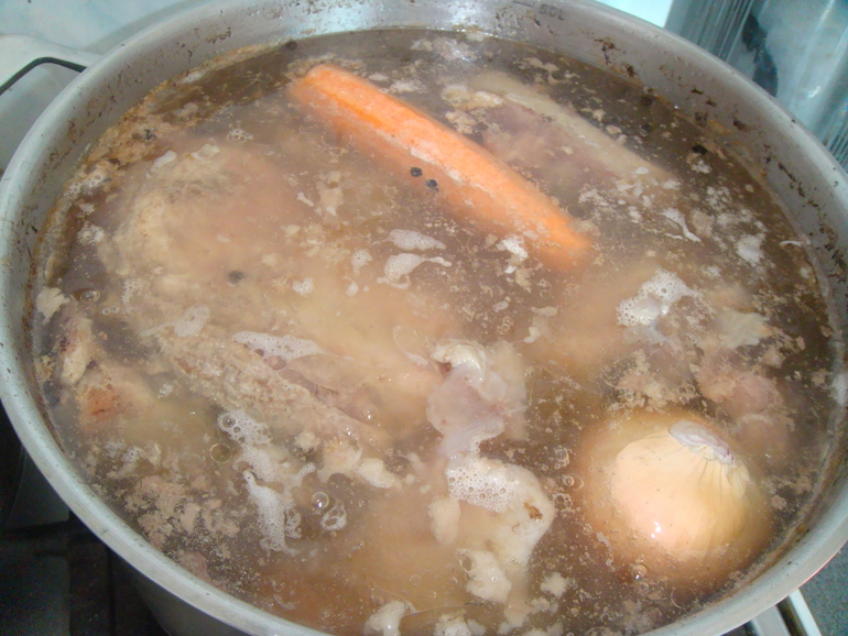 После закипания снимаю пену, солю, перчу, закрываю крышкой и ставлю на минимальный огонь на 4 часа. Затем добавляю морковку и луковицу, с оставленным последним слоем шелухи: