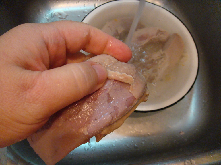 Заливаю на несколько часов холодной водой, потом срезаю всю грязь.