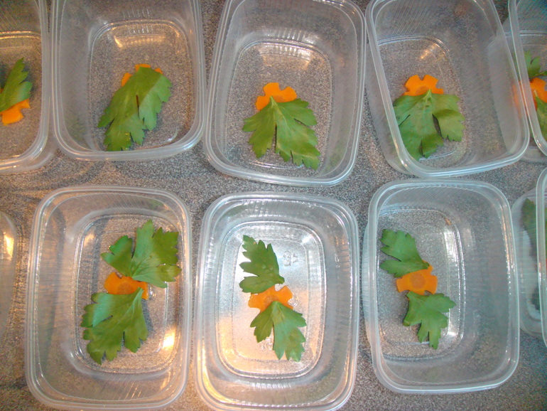 Заливать студень люблю в порционные контейнеры, в которых сначала укладываю морковку и веточки зелени для украшения: