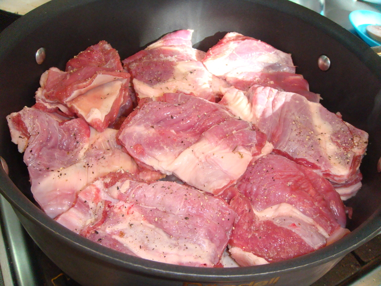 Потом мясо, не забывая его солить и перчить: