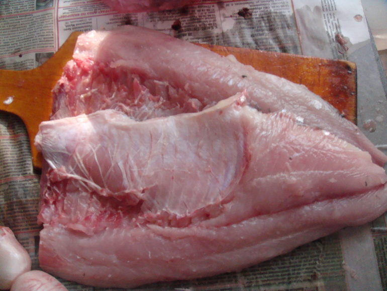 Срезать филе (я очень люблю жарить именно филе, не возясь с костями). Просто срезать мясо вдоль хребта с одной стороны: