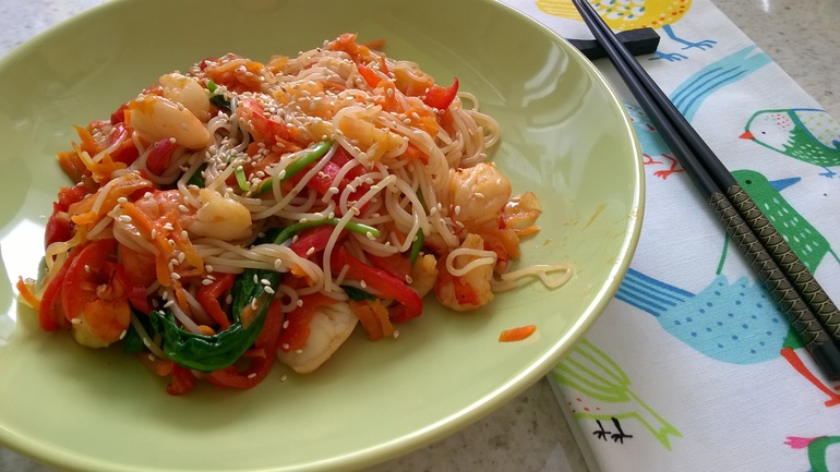 Рисовую лапшу с креветками в азиатском стиле я обожаю!) В этом году даже обзавелась собственным сухим бульоном Хондаши.