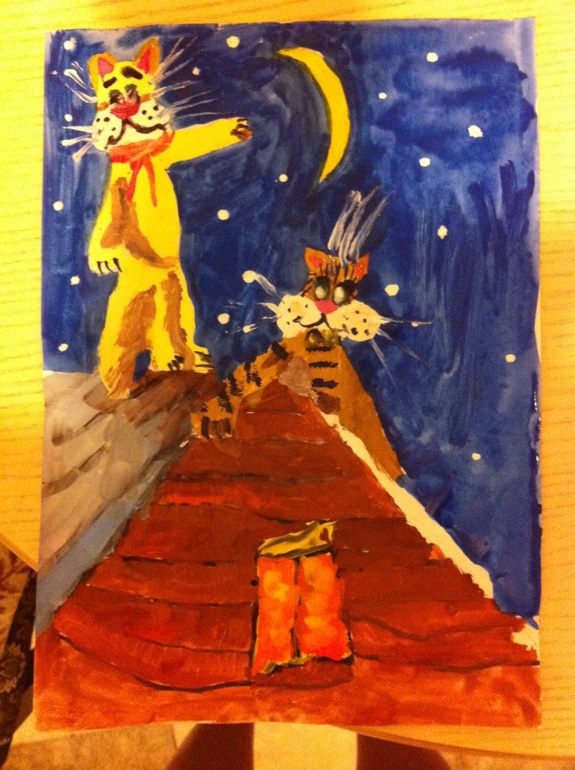 Пока я загружала посуду, она срисовывала картинку карандашом. Раскрашивали вместе. Точнее я помогала смешивать цвета, раскрасила небо и усы нарисовала ????
