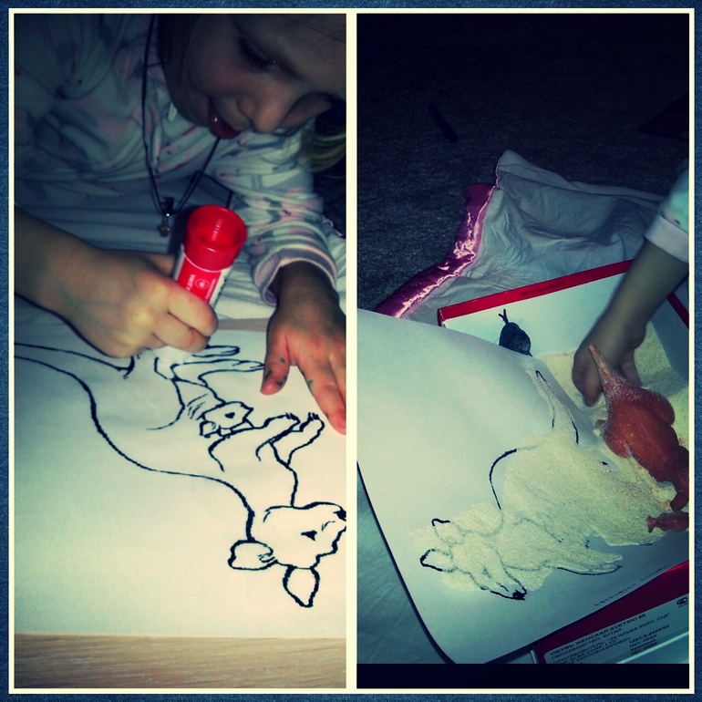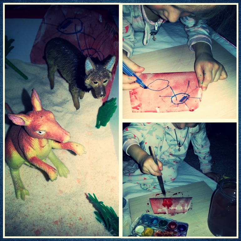 Аня сделала гору и слушала сказку про Кенгуру и ее сумочку.