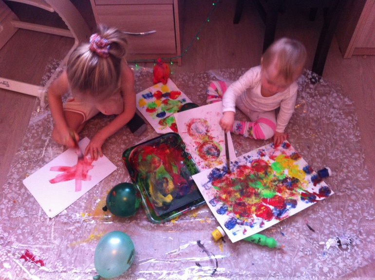 Аня рисовала пулевизатором, Варя кистью, а потом все дружно разлили содержимое бутылок вокруг ????