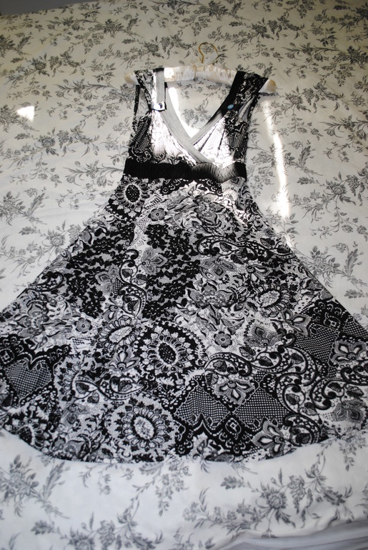3. Черное платье с белым узором Трикотаж. Глубокий вырез. Рукава и подол отделаны кружевом. Цена 300 р.