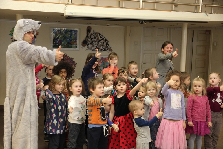 Спектакль очень подвижный, детки все время помогают главному герою убегать от хищников (кидают ягодки, танцуют, играют, прыгают и т.д). Сыну почти 6 и ему было очень интересно. Спектакль точно понравится деткам, которым интересно принимать непосредственное участие в действии и которые не боятся интерактива, т.к. весь спектакль построен на активной работе актеров с залом.