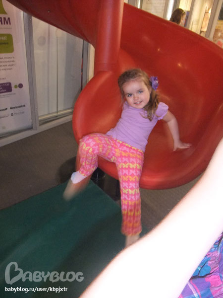 Младшая сразу увидела горку: совсем как на площадке! Вдоволь там накатавшись, пошла по залу.. а там..