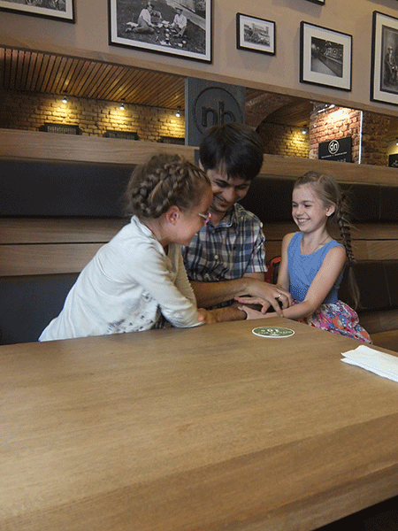 А... это интересно.. В ресторанчик рядом с домом никак не могли зайти, работает с 15-ти, а мы к этому времени далеко в центре.. Домой возвращались только поспать)) Тут вернулись в 21 примерно и зашли.. Официант обрадовался, увидев стОлько детей, спросил как тойз по русски? - Игрушки!. и.... принёс игрушки.. Это были солдатики!))) Соня в удивлении! ))