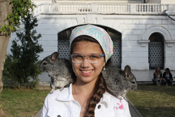Сонька побоялась держать шиншилку в руках.. Но согласилась подержать на голове :-)