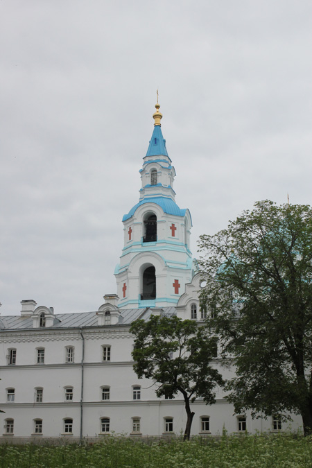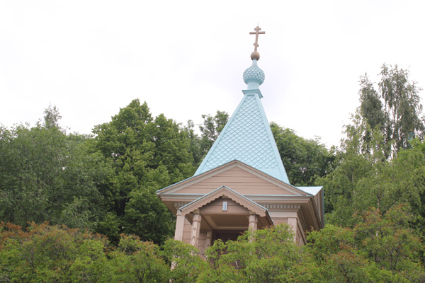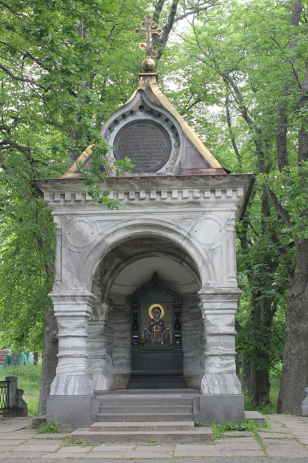 Позади Знаменской часовни - аллея вековых деревьев, которая уходит в сторону гостиницы «Зимняя» и монастырским садам...