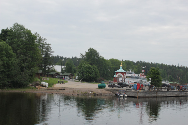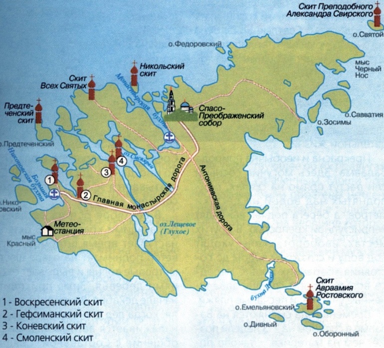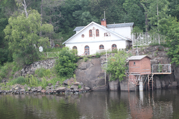 Поднявшись от пристани по гранитной лестнице из 62 ступеней, сооруженной в 1877 году при игумене Дамаскине, справа видим часовню в честь иконы Божьей Матери «Знамение», которую называют также Царской.