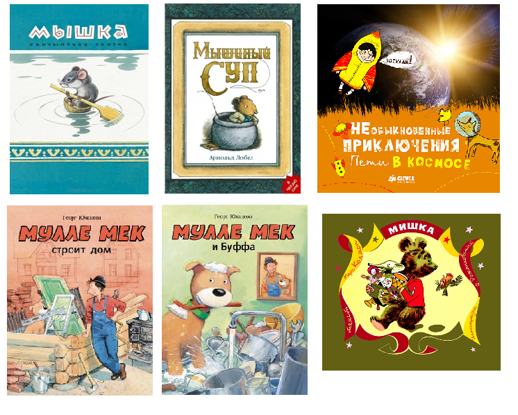 Сказку "Мышка" купила ради иллюстраций Петра Репкина. Увидела и влюбилась. Шрифт мелковат, сказка своеобразная. Мышка плыла в скорлупке, а дети на разных берегах предлагали ей пирожки и всё ее не устраивали начинки. Когда же начинка пришлась ей по вкусу, то мышка съела так много пирожка, что когда запнулась и упала, живот у нее лопнул и пришлось девочкам его зашивать. Данька смеялся, по мне порванный живот - не смешно, а ужасно.