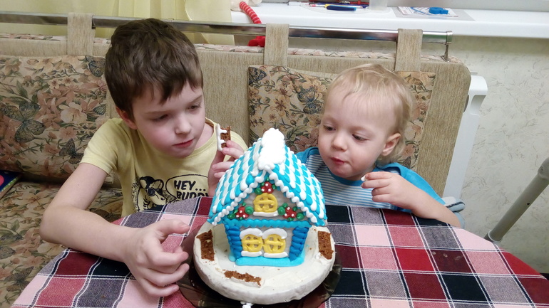 Ага, красавец!)) Но это детей не остановило. Дима удивил, как-то сразу понял, что домик съедобный и потребовал свою долю))