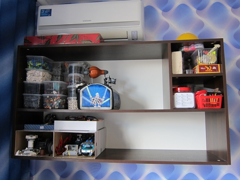По моих прогнозам порядо года на два) Дима сейчас не дает толком пособирать Дане конструктор, поэтому детали оказались на полке на стене (раньше под Лего у Дани был выделен журнальный столик). А высоко и не в поле зрения, значит обращений меньше. Последние месяцы Даня играет только собранным и человечками. Вот Дима дорастет, тогда и будут вдвоем собирать, а пока храним...