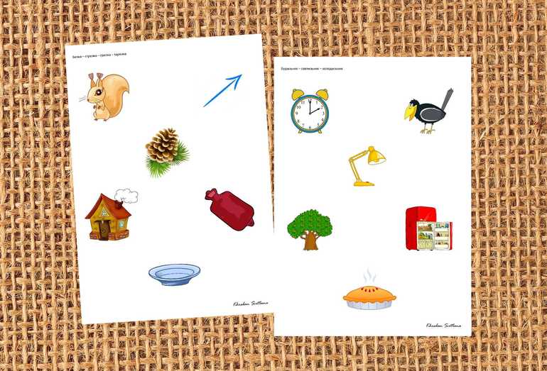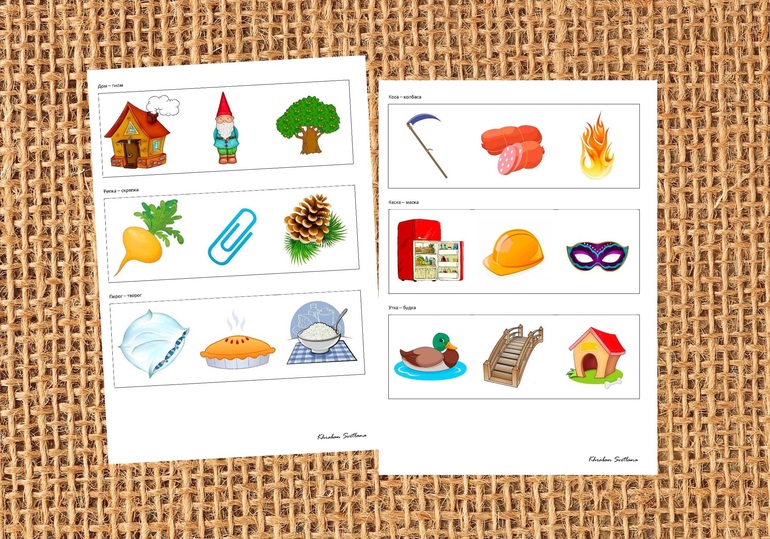 Предложите ребенку найти на листе всё, что рифмуется друг с другом. Для более младшего возраста и для упрощения задачи можно подсказать одно слово. Можно также предложить вариант с исключением лишних предметов, т.е. тех, что в рифму не укладываются. Предложите ребенку соединить в рифмы все возможные названия предметов из предложенных, а лишние изображения отметить (обвести, зачеркнуть).