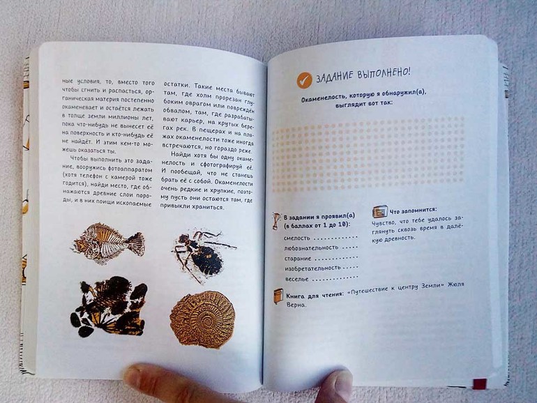 Помимо инструкции, как выполнить задание, предлагается и оценить результат своей работы. По 10-тибалльной шкале определить, насколько была проявлена смелость, любознательность, старание, изобретательность и веселье. В графе "Что запомнилось?" подчеркнуть предложенные варианты. Этими вариантами являются эмоции и действия, ради которых и затевалось все эти приключения: густые запахи земли и древесной коры, приятная усталость от возни с целой горой снега, горящие от мороза щеки, нескончаемое ожидание, тайна, страх перед пустым листом бумаги, звуки, которые ласкают твое сердце и будоражат кровь....