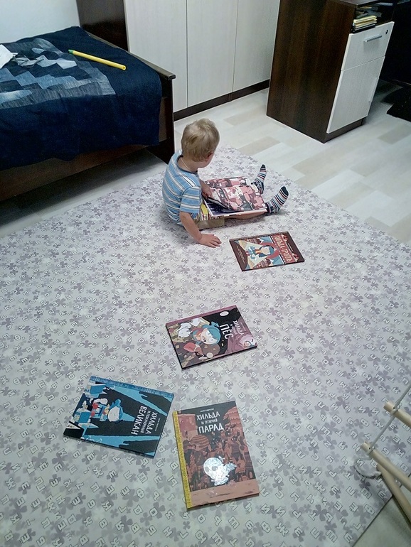 Чтобы не быть голословной про любовь. Как младший (2,8 года) "читает" Хильду. Разложит всю серию перед собой, выберет книгу и ... 20 минут тишины.