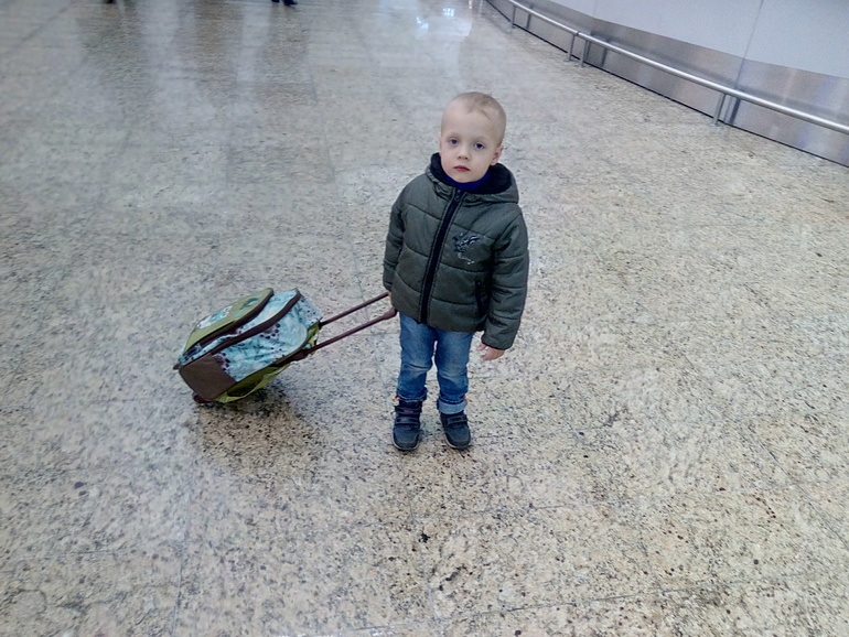 На фото серьёзный. Остановила, когда бодро шагал к самолету.