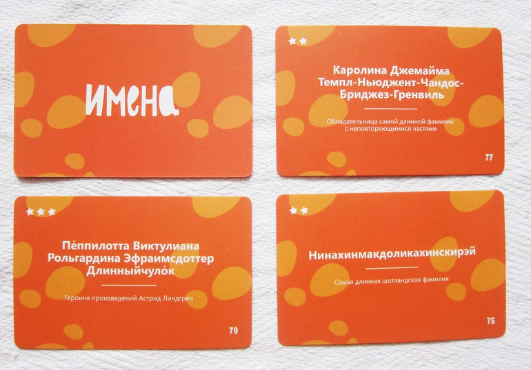 Из некоторых карточек мы узнаем самые длинные фамилии. Другие карточки нам напомнят, что необычными именами могут обладать литературные персонажи (интересно, сами авторы придуманных имен помнят их наизусть?)