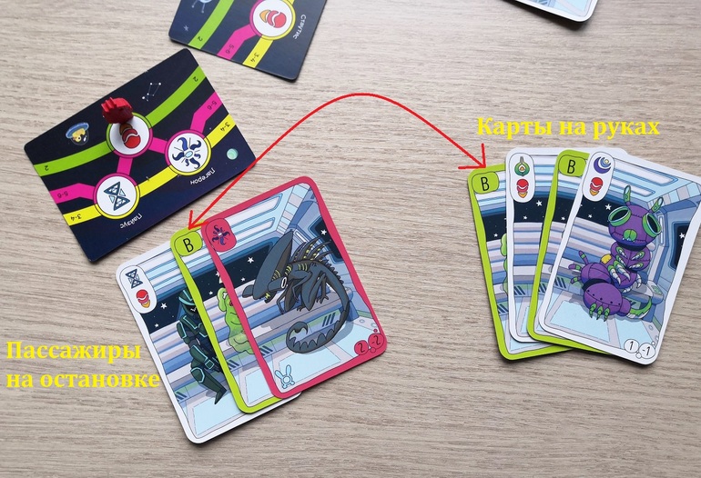 Вот пример. В нашем салоне уже два вортанца! Мы приезжаем на планету и ура, там есть еще один. Неважно, какой он по счету в очереди. Таких всегда пропускают) Мы скидываем одного с руки и второго с остановки в сброс. Второй на руке остается. Нам бы стоит найти ему пару, а то в конце игры он сильно подпортит нашу репутацию.