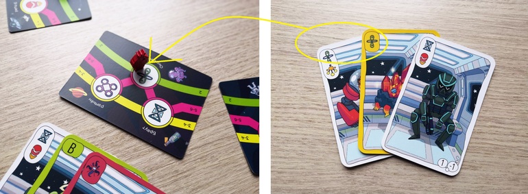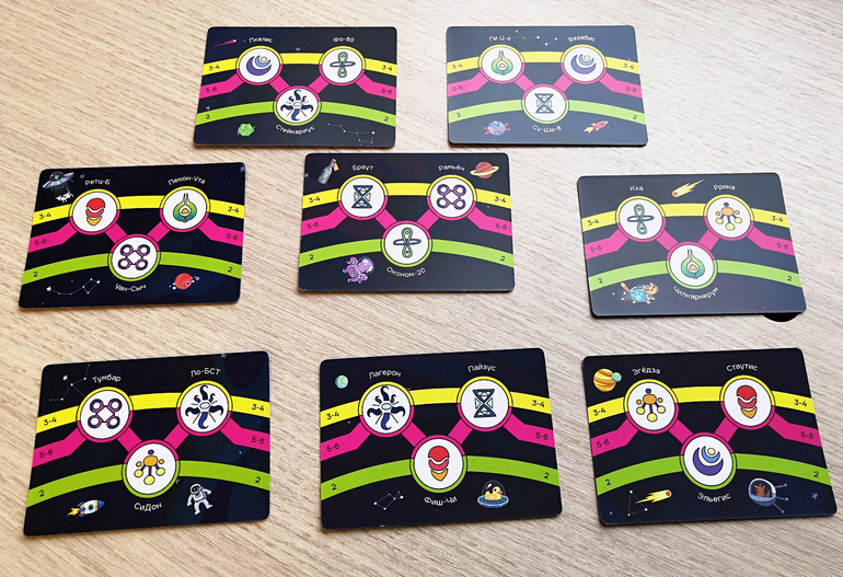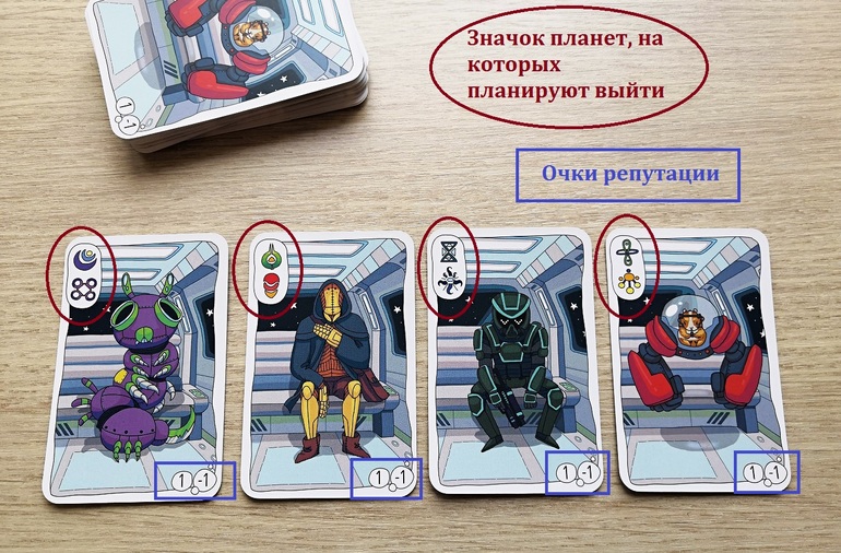 3. Высадка пассажиров: остановившись на определенной планете, игрок высаживает пассажиров с таким же значком. Карты высаженных пассажиров переворачиваются рубашкой вверх и кладутся рядом с игроком.
