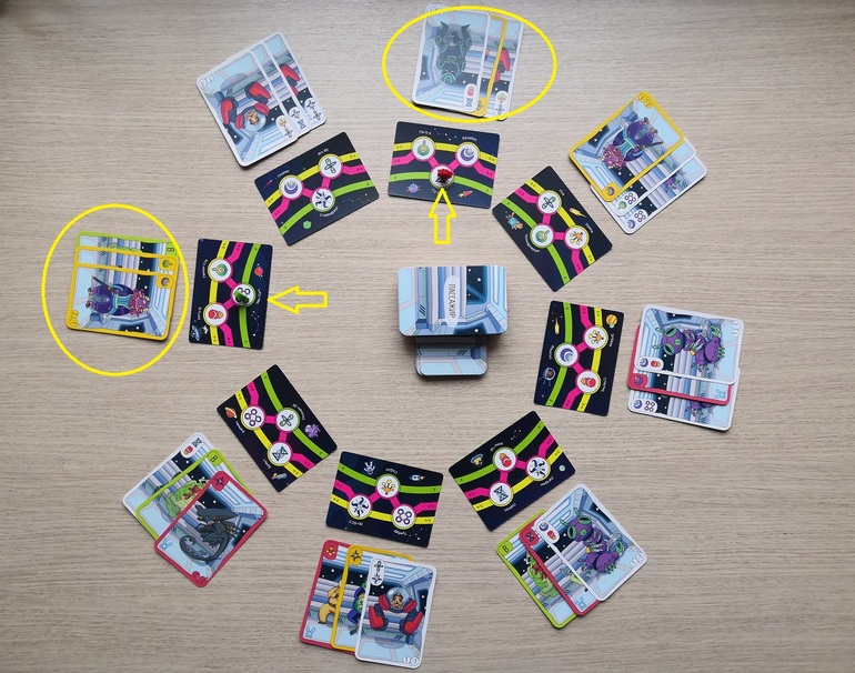 2. Появление новых пассажиров: после того, как транспортное средство переместилось, из колоды пассажиров в центре стола выкладываются пять карт пассажиров в очереди на планетах. Карты выкладывается против часовой стрелки, начиная с ближайшего сектора, где остановилось такси. Т.е. появляется пять новых пассажиров за спиной водителя)