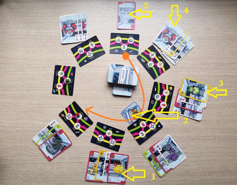 Вот, как это выглядит. Мой первый ход. Перемещение моего корабля отмечено оранжевой стрелкой. Теперь я беру пять карт пассажиров и начинаю выкладывать из против часовой стрелки. Добавляется "заяц" в ближайший сектор (1), затем контролер (2), который кладется во внутренний круг под карту маршрута, далее в очередь встает богатый господин (3), обычный житель (4) и снова заяц (5).