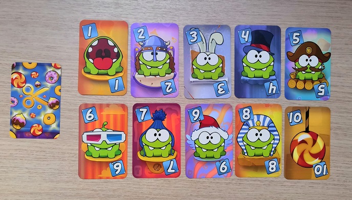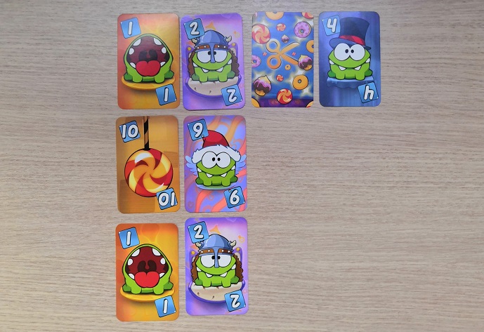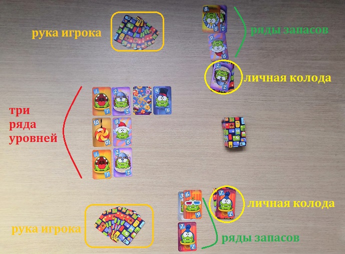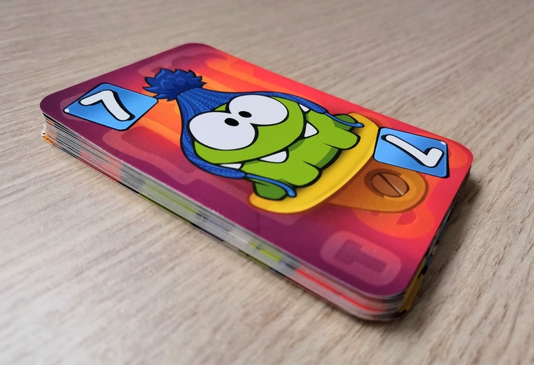 Итак, карточная игра Cut the Rope. Цель игры - избавиться от личной колоды карт. При игре на 2-3 игрока эта колода состоит из 20 карт, 4-5 игроков - 16 карт, 6-7 игроков - 12 карт, 8 игроков - 10 карт. Перемешиваем всю колоды, отсчитывает нужное количество карт для личной колоды, выкладываем их рубашкой вверх, верхнюю вскрываем. Мы готовы играть.