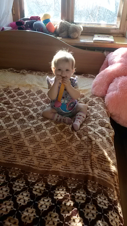 Знает и показывает глазки, носик, ротик. Умеет держать телефон и "звонить" бабага(бабе))