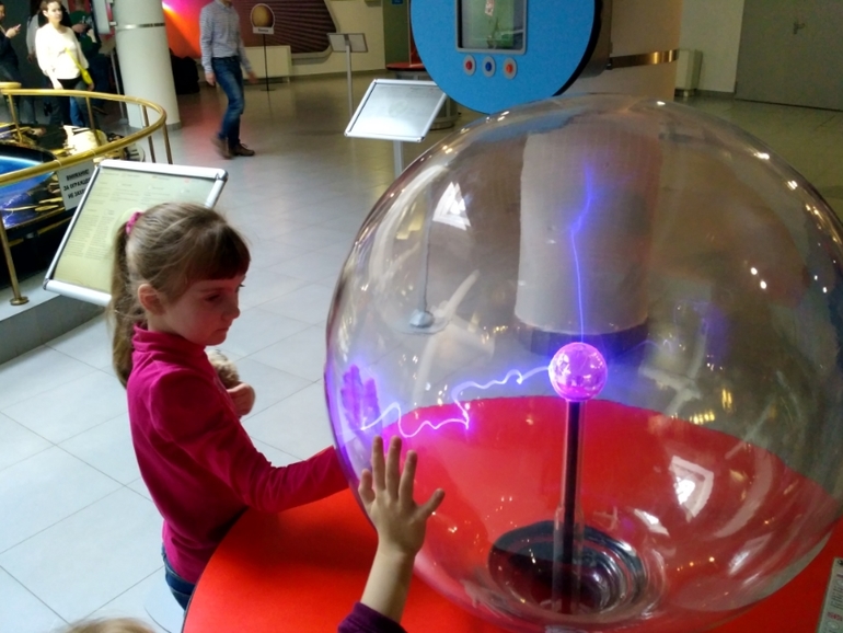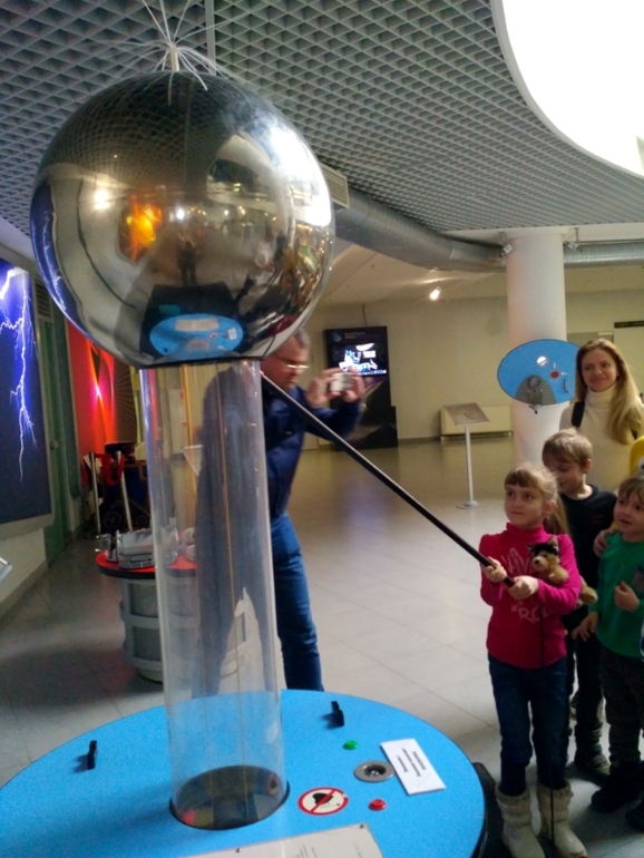 Шар тесли я ей дома показывала . Бежала к нему быстрее экскурсовода. Да еще и лампочку потом зажгла.