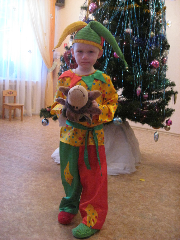 Костюм для утренника взяли у знакомых, колпак не налез, пришлось варганить самой. Дома оказались нитки подходящего цвета. Колпак связался урывками за неделю, во время дневных снов младшего. В комплект связала "чешки", которые одели прямо на сандалии. Планировалось, что буду шить сапоги из фетра, но накосячила и переделывать уже не стала.