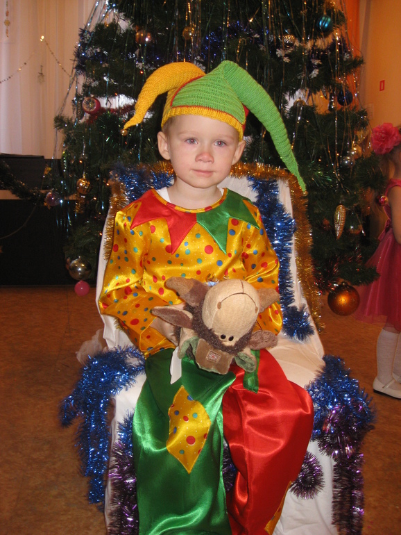 Мой впечатлительный мальчик весь в слезах и с красным носом: "мама, я хочу к тебе", "мама, я хочу домой". Но в действии тем не менее участие принимал, пел и танцевал вместе со всеми, но с оглядкой на меня. То и дело пускал слезу и утирал нос. И, к моему удивлению, пошел и рассказал стих Деду Морозу, который мы с ним подготовили. В паузах бежал сесть поближе ко мне, а когда один раз не успел занять место рядом, тут же расстроился и чуть ли не по головам девочек стал пробираться ближе.