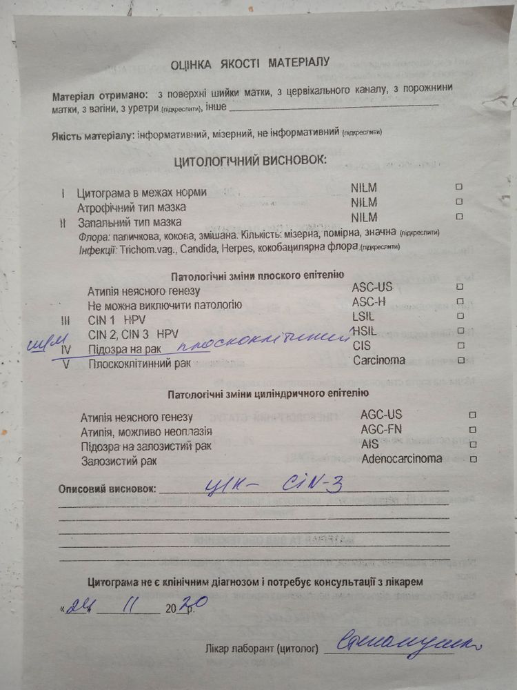 В субботу нам стало 10 неделек. Вчера по кольпоскопии и цитологии в онкодиспансере мне поставили подозрение на плоскоклеточный рак шейки матки. Онколог отправляет на аборт, во время которого будет взята биопсия, а потом на дообследование и лечение.