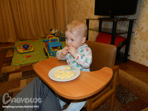 Красавчик! А мы в коляске едим. Не может на стульчике, отвлекается. А чего вы там хомячите? никак кукурузные палочки?